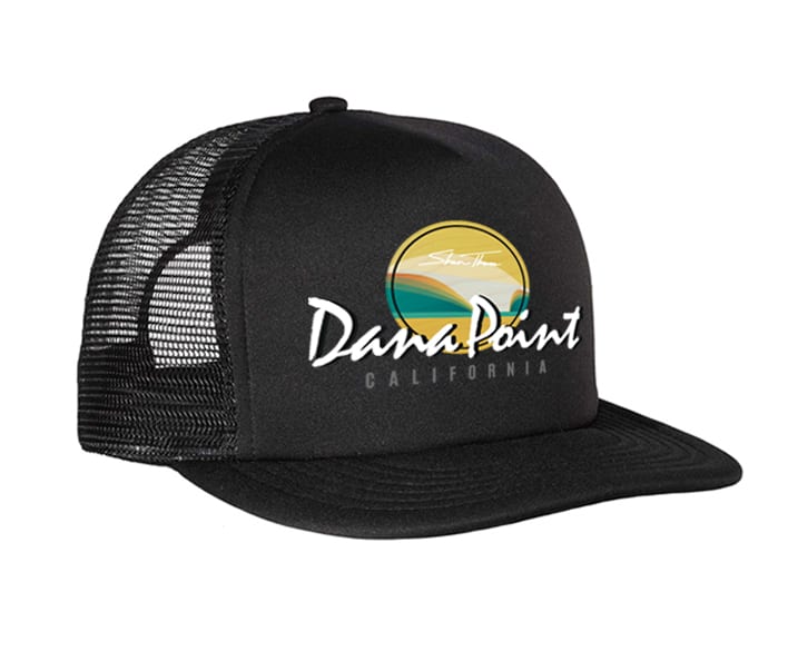 “Beach Break” wave artwork inspired by a local Southern California beach break by artist Shaun Thomas. Chose from a variety of locations including California and beach cities all along Southern California as well as Baja Mexico and Hawaii. This 100% polyester trucker cap is one size fits most with the adjusted snap back.