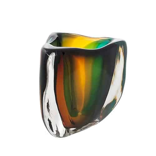 The glacier series is an exploration of glass and color in pure forms inspired by frozen ice flows and crisp clear light. Thick glass and overlapping transparent colors are used to create pieces that will color shift depending on one’s vantage point.