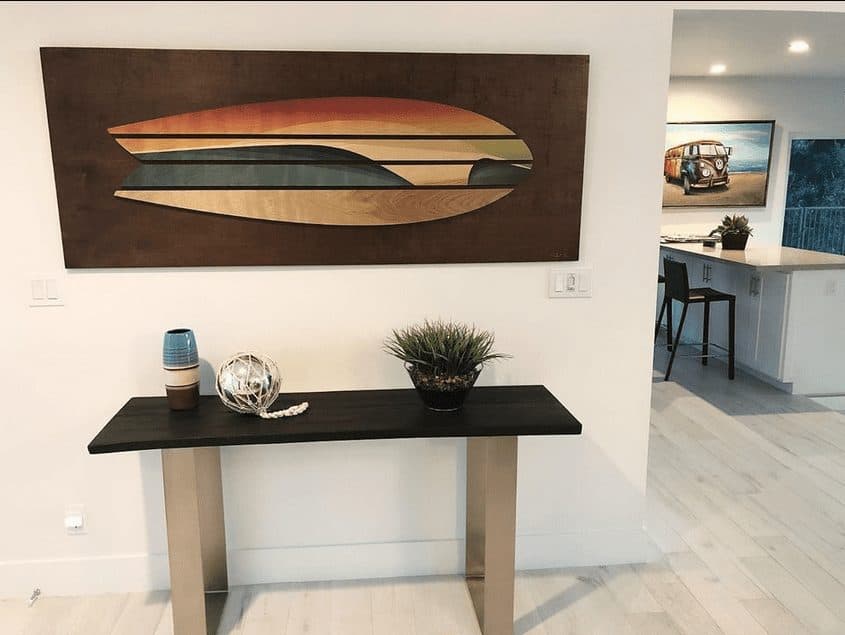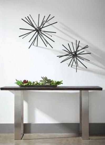 The blend of mixed material gives this Sofa Table a modern look with a transitional feel. Made with Solid Oak with a Brushed Nickel base.